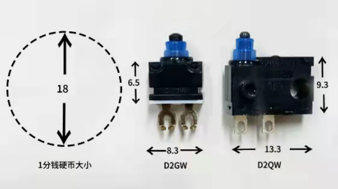 一分錢的硬幣直徑18mm,邊厚1.25mm,而D2GW開關(guān)外形尺寸W8.3mm×D5.3mm×H6.5mm,可以說是目前市面上體積非常小的開關(guān)了。