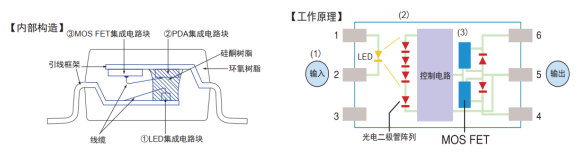 工作原理:輸入側通電后LED會發(fā)光,這束光通過在輸出側的光電二極管陣列受光后發(fā)電,再次轉換成電壓,該電壓通過控制電路變?yōu)橛|發(fā)電壓來驅動MOSFET。