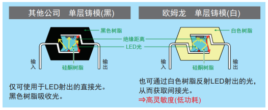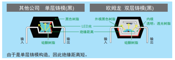 歐姆龍通過雙層鑄膜構造確保較長的絕緣距離,實現(xiàn)高絕緣性,更是推出了DIP、SOP的黑色封裝系列產品,DIP:支持AC5000V,SOP:支持AC3750V