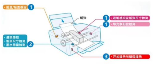 2、進(jìn)紙感應(yīng)會(huì)用到反射式光電開關(guān),主要起到的作用是檢測紙張尺寸以及墨水。