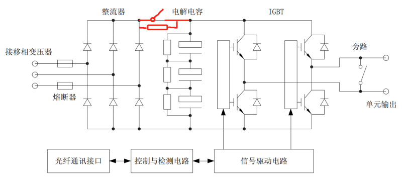 在整個(gè)串聯(lián)過(guò)程中,我們不得不聊到的,如何實(shí)現(xiàn)各串聯(lián)單元的節(jié)能效果。是否能在每個(gè)串聯(lián)單元內(nèi)加入繼電器,進(jìn)行旁支接入,從而解放前端整流器持續(xù)輸入的效果,實(shí)現(xiàn)后端電解電容的輸入輸出使用繼電器進(jìn)行控制,從而達(dá)到節(jié)能效果。如下圖所示: