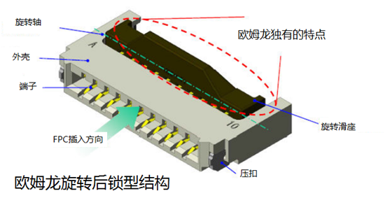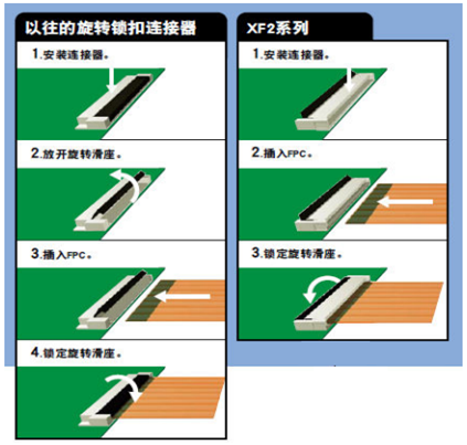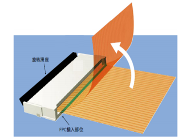 一、 旋轉(zhuǎn)式滑座從FPC插入口獨(dú)立出來。這樣一來,提起FPC時(shí),滑座并不會(huì)斷開。這就保證了即使受到過度的外力,安裝好的FPC也不會(huì)脫開。