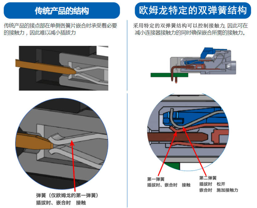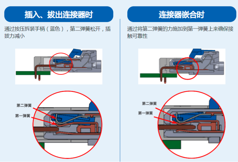 特征1其特點(diǎn)雙彈簧結(jié)構(gòu):在嵌合時(shí)通過(guò)第一彈簧和第二彈簧的接觸合力確保接觸可靠性,并在插拔時(shí)通過(guò)操作手柄打開第二彈簧來(lái)減小插拔力。如下圖
