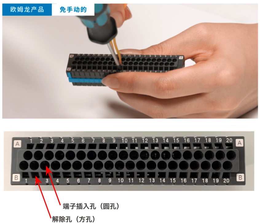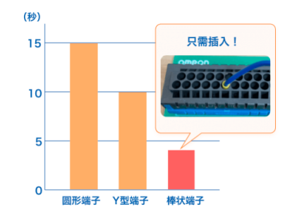 相比采用螺釘方式連接圓形端子、Y型端子,以推入方式連接棒狀端子時(shí)的連接工時(shí)可減少60%以上。
