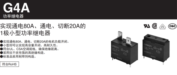 歐姆龍G4A系列繼電器,實現(xiàn)通電80A、通電、切斷20A的電機負(fù)載開閉,1極小型功率繼電器,卻可以實現(xiàn)高容量開閉、高耐久性。符合RoHS、EN/IEC(VDE認(rèn)證)、UL、CSA空調(diào)規(guī)格,確保絕緣距離,采用抗干擾性強的高絕緣構(gòu)造。標(biāo)準(zhǔn)品采用耐助焊劑構(gòu)造。