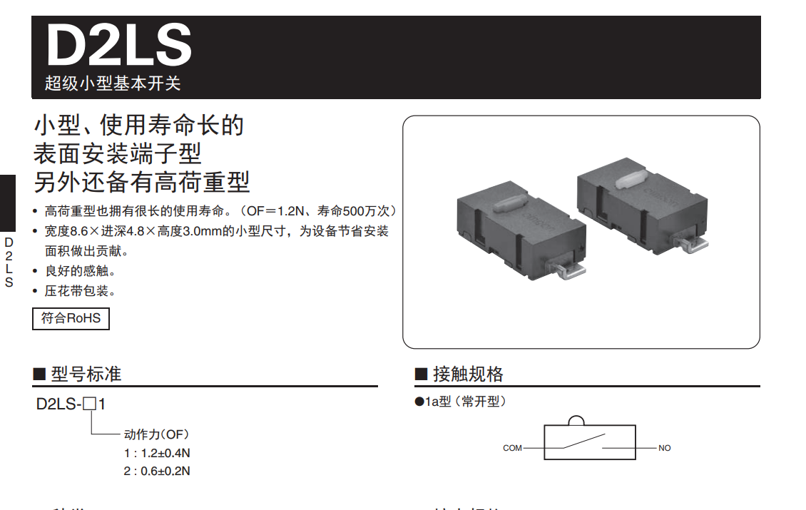 在智能插座中會(huì)有用到歐姆龍的微動(dòng)開(kāi)關(guān)和繼電器,今天我們來(lái)說(shuō)說(shuō)開(kāi)關(guān)插座中最常用的歐姆龍產(chǎn)品系列,D2LS和SS系列,如下圖