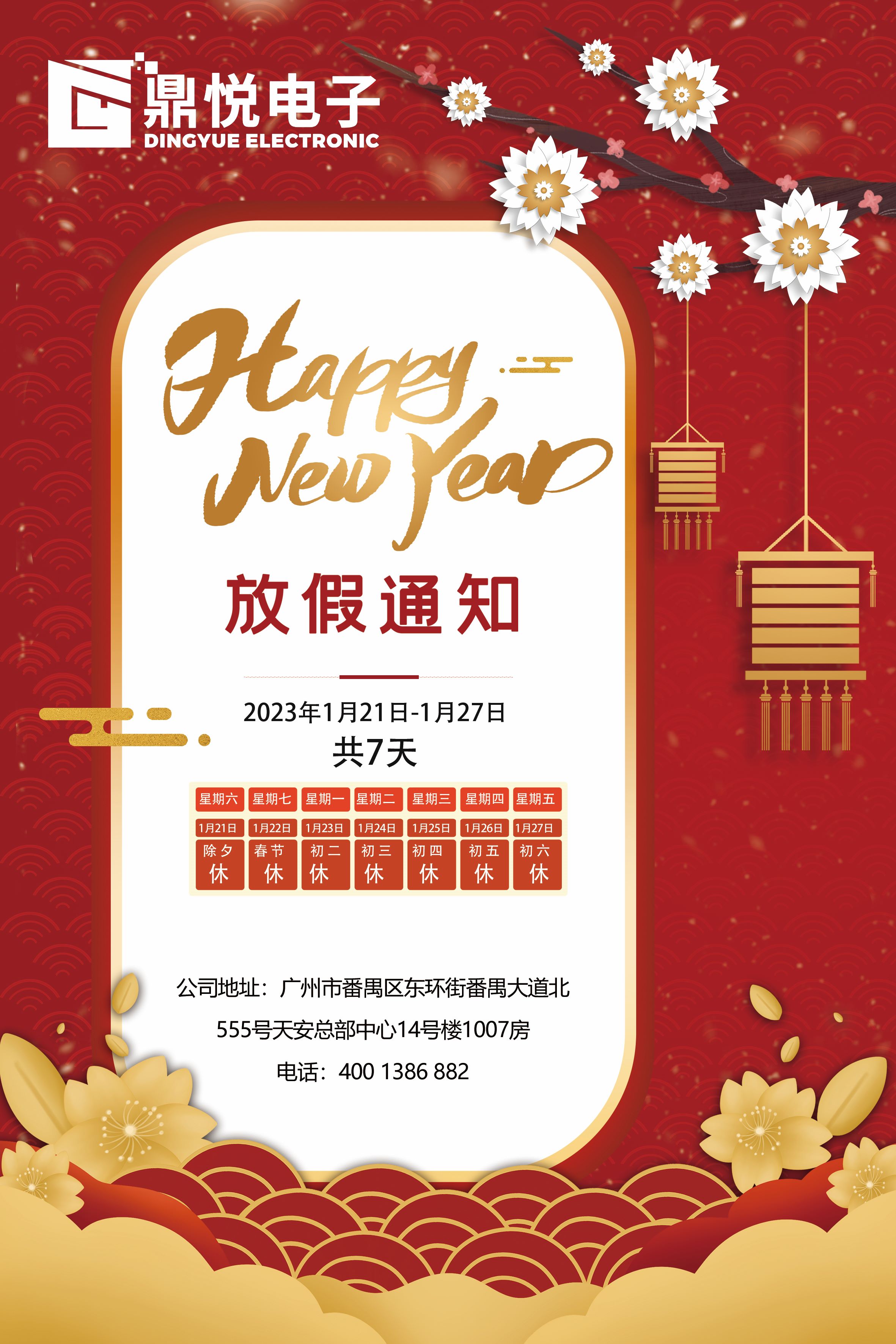 您好!感謝您對鼎悅電子的支持和厚愛!正值新春佳節(jié)來臨之際,廣州鼎悅電子科技有限公司攜全體員工在此向您及您的家人送出最真摯的祝福:祝您新年快樂!萬事如意!在新的一年里身體健康!事業(yè)更上一層樓!在新的一年里我們也將以更真誠,專業(yè)的服務回饋廣大客戶!