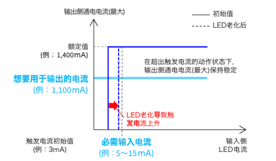 晶體管耦合器在增大輸入側(cè)電流時(shí),輸出側(cè)電流也會變大,所以與MOS FET繼電器相比,會消耗更多的電力。LED老化會使輸出也跟隨減弱,由此需要更多的電力;