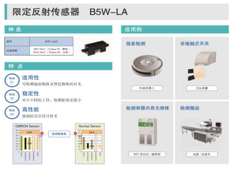 歐姆龍反射型傳感器可以使掃地機(jī)在運作中遇到障礙物時,可透過機(jī)身感應(yīng)而變換方向,避開桌椅角、臺階等,減少碰撞、防止掉落機(jī)會,歐姆龍限定反射型傳感器B5W-LA01可以檢測鏡面反射物體和透明物體,不易受檢測物體顏色,材質(zhì)影響,穩(wěn)定性高,模擬電壓輸出,最高檢測距離70mm。