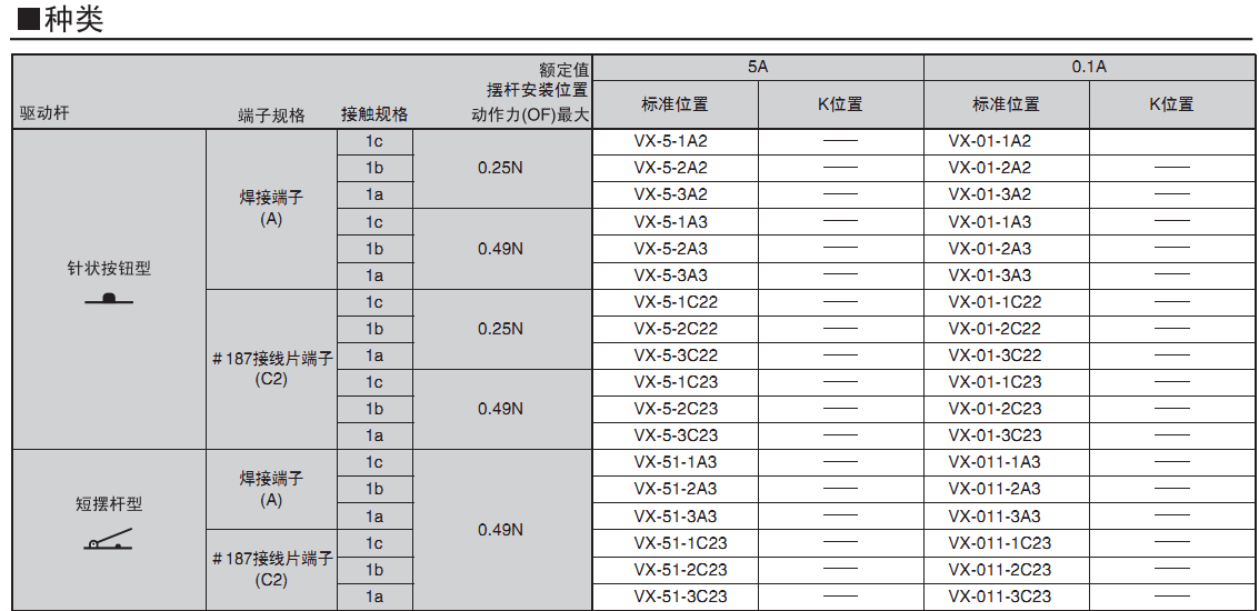 ? 從微小負載到5A型品種豐富多樣,和V系列小型基本 開關(guān)形狀相同。