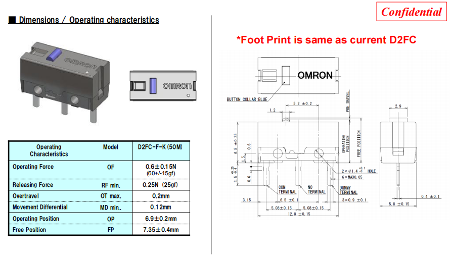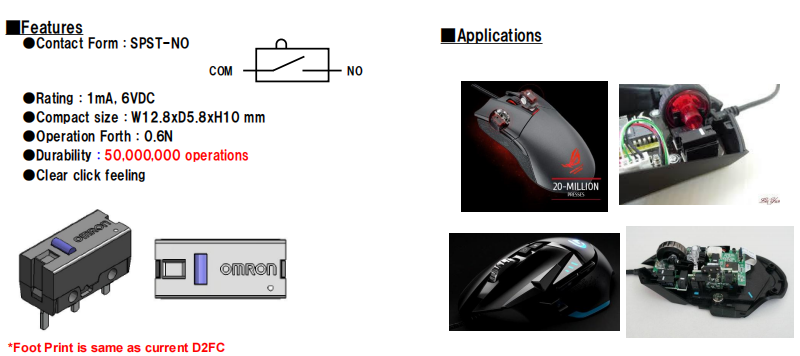 D2FC-F-K(50M) 5000萬次鼠標(biāo)開關(guān)屬于超級小型基本開關(guān),外殼尺寸為:12.8*5.8*7.3(mm)